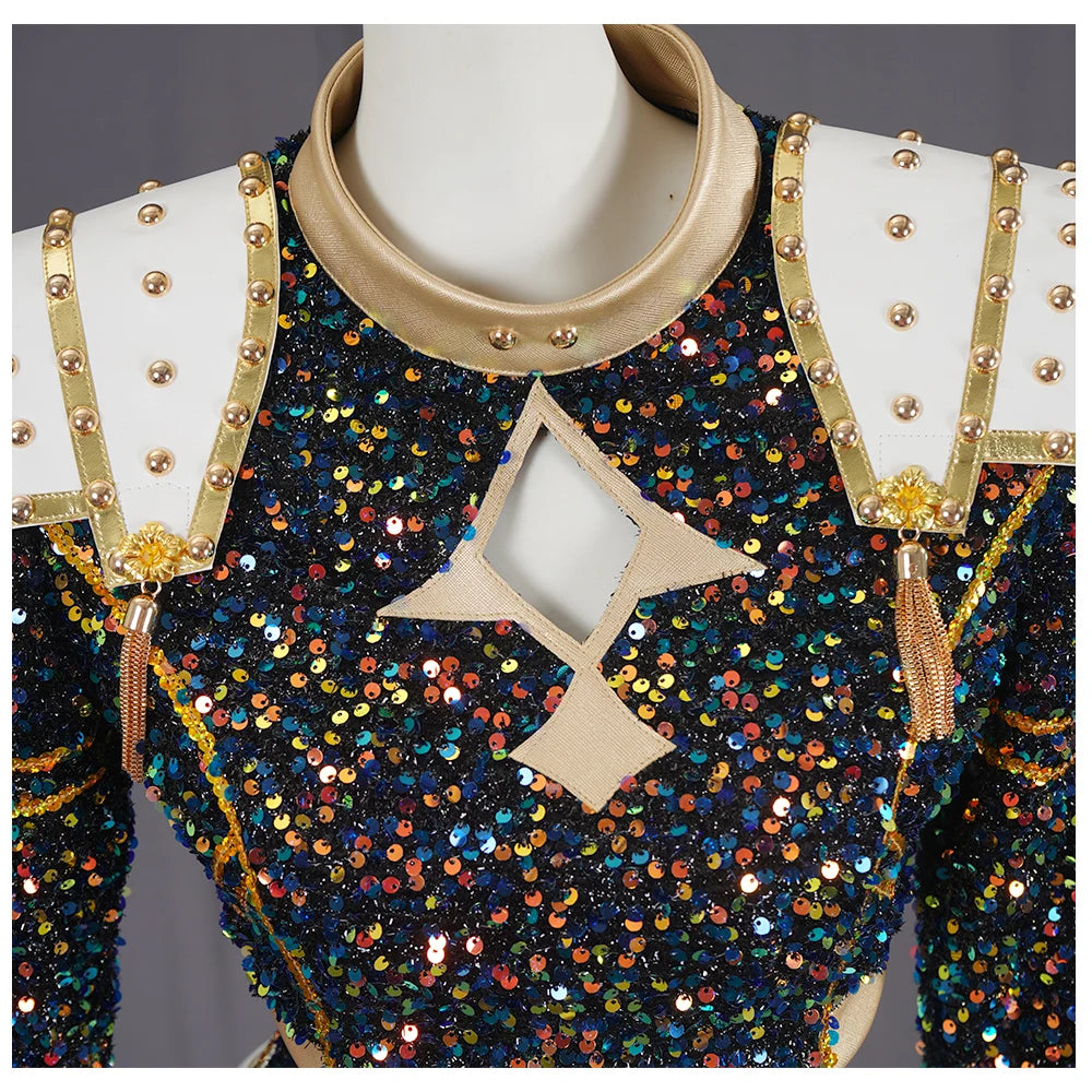 Style : costume de scène K-Pop avec paillettes éclatantes, fidèle à l’univers du film